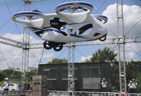 日本電氣巨頭NEC8月5日在東京郊外的一處試驗場地成功試飛無人駕駛垂直起降飛行汽車原型車,由電池提供動力的原型車在4個螺旋槳的帶動下垂直起降,在3米多高的空中懸浮了大約1分鐘。