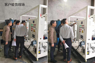 三一集團客戶到工廠驗收雙級真空濾油機,我司針對客戶油品及現(xiàn)場使用環(huán)境等情況,做出相應技術(shù)修改,客戶認可現(xiàn)場調(diào)試驗收合格。